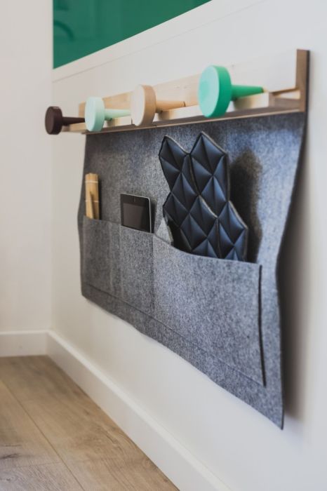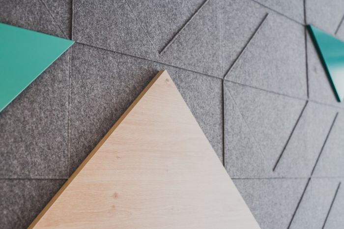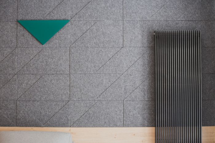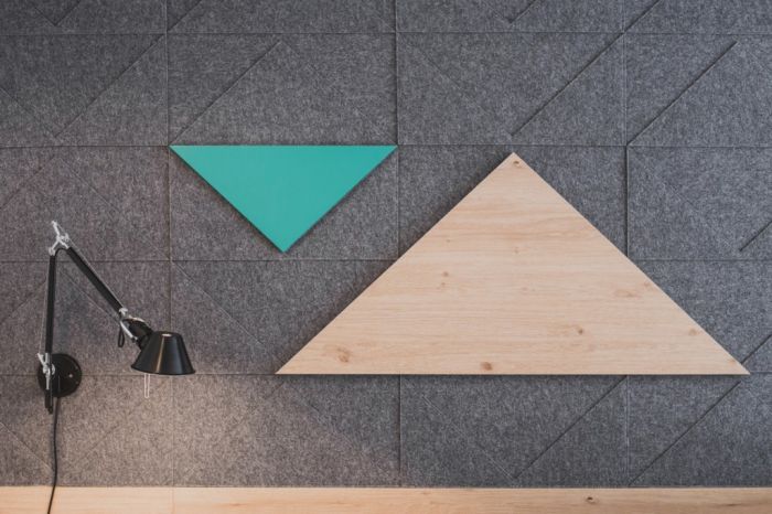 Очень ярким и креативным элементом интерьера стали фетровые обои. И такая отделка была выбрана не просто так, она служит в качестве звукоизоляции и дополнительного утеплителя. К тому же, смотрятся шерстяные обои очень необычно и декоративно.
