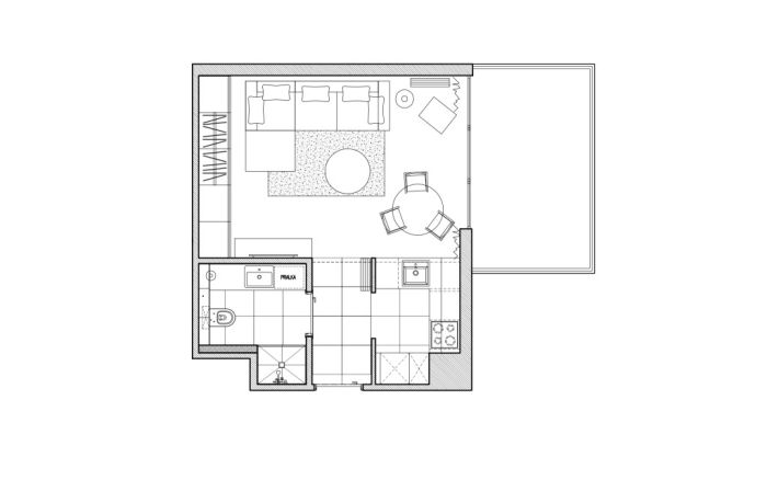 Одно небольшое окно с балконной дверью решили заменить и сделать сплошное остекленение, что позволило впустить в небольшую квартиру максимум естественного света. Это хорошее решение для небольших пространств, где есть всего одно окно. Тем более, что сегодня производят массу энергоэффективных стеклопакетов. Так что можно не беспокоиться, что в квартире от этого будет прохладнее.